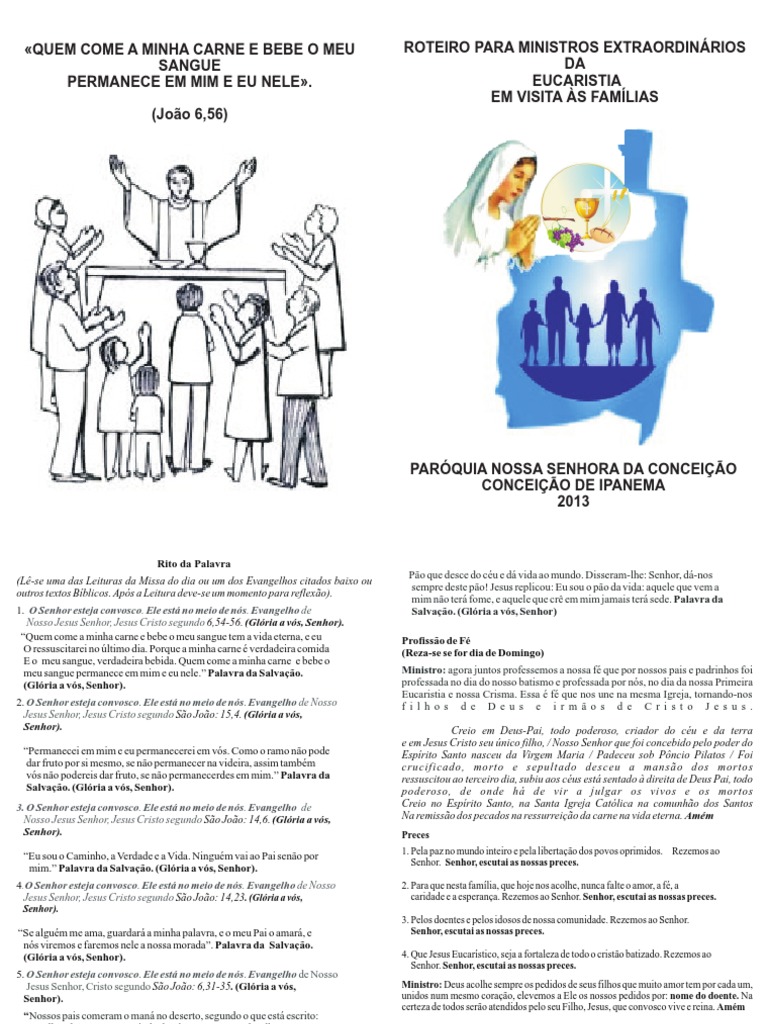 a Sagrada Comunhão nas missas em que haja grande número de fiéis. A missão dos ministros da eucaristia deve ser: participação constante nas celebrações de toda comunidade; vida Eucarística na Igreja e na vida social; união com Cristo pela palavra, leitura e reflexão da palavra de Deus. Também é função do ministro da Eucaristia.